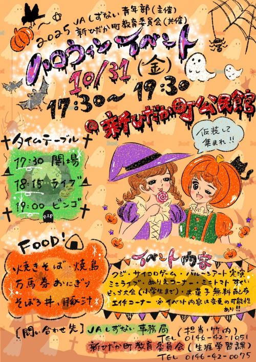 「ハロウィン2025」が新ひだか町公民館でR7.10.31日開催され、家族連れや子どもたちで賑わいました。
